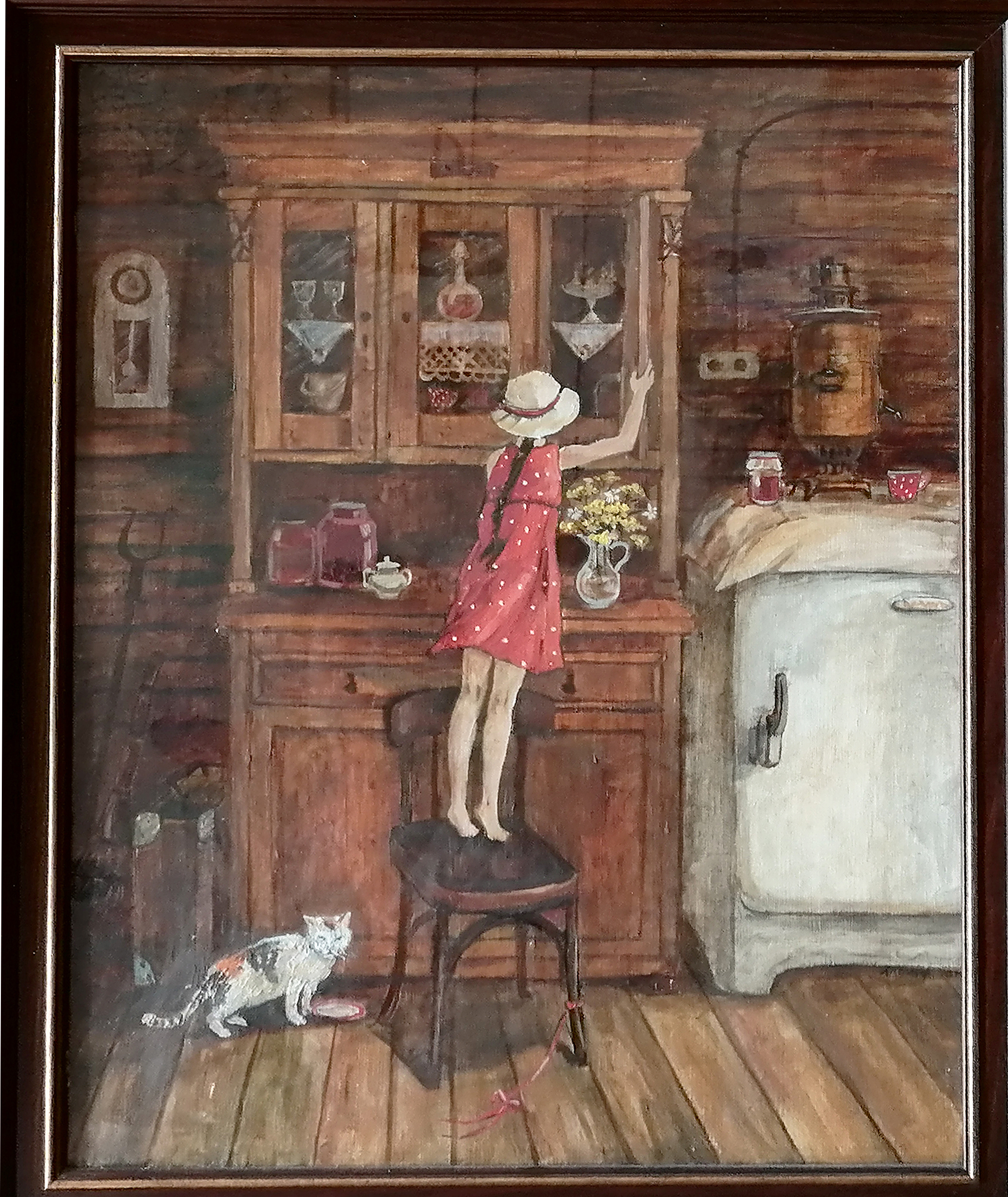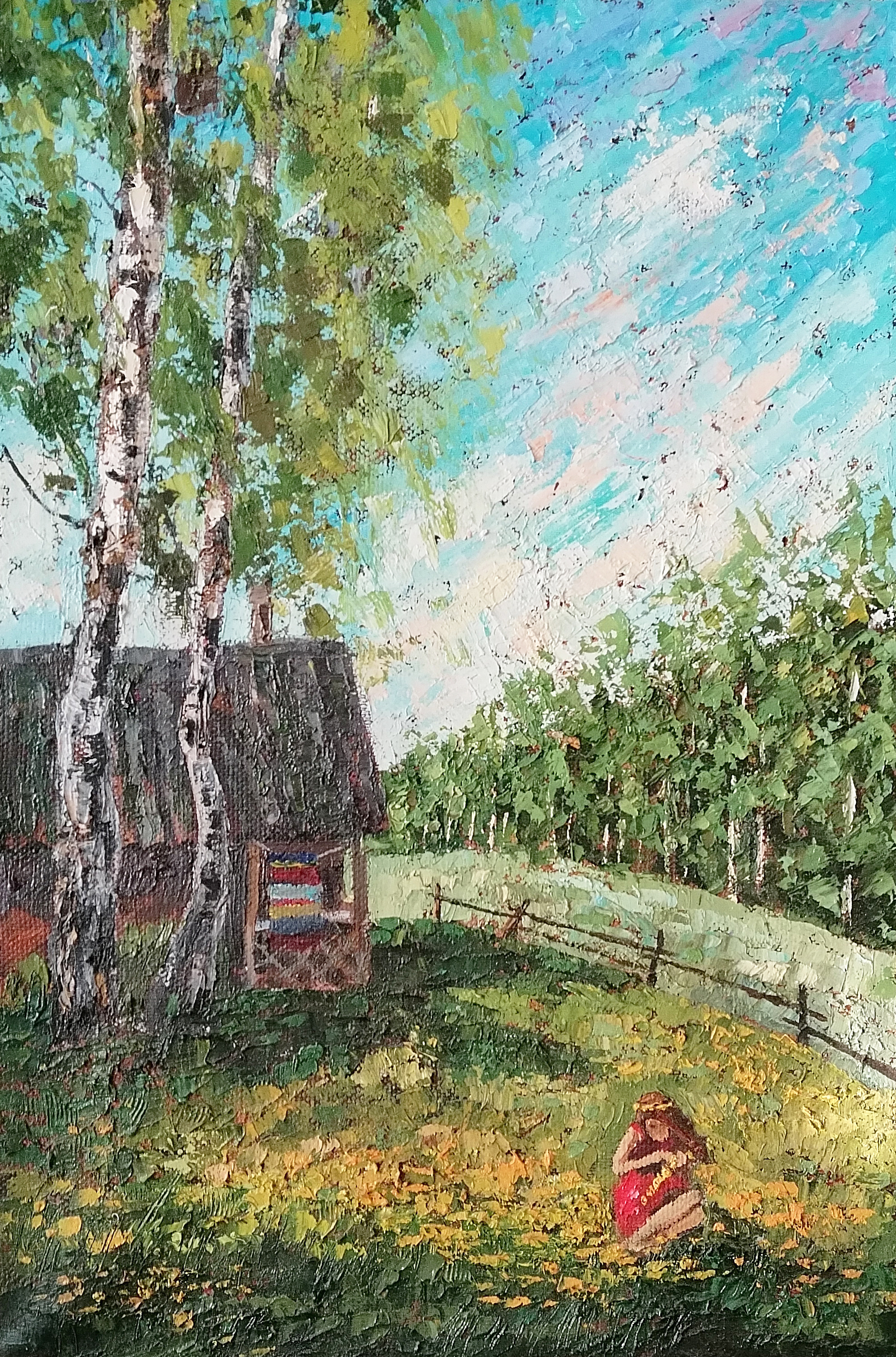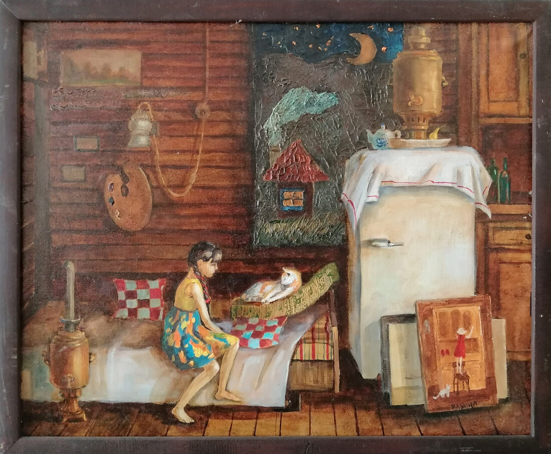 Во время написания картины у меня погиб мой кот. И на память о нем я его пририсовала в окне. Изначально задумка была другая. Вот такая история.   Основная часть моих работ на этой выставке посвящена деревне.