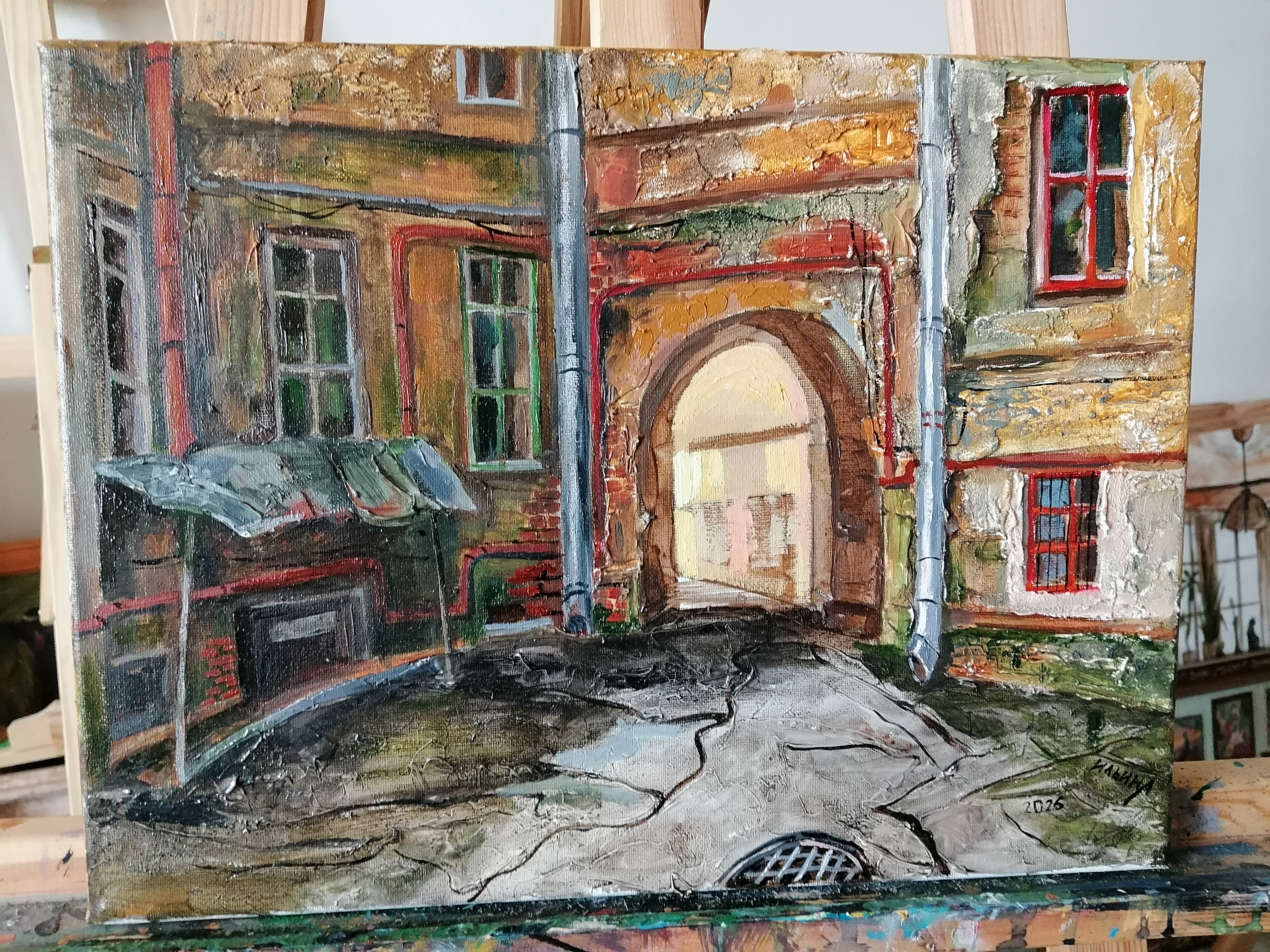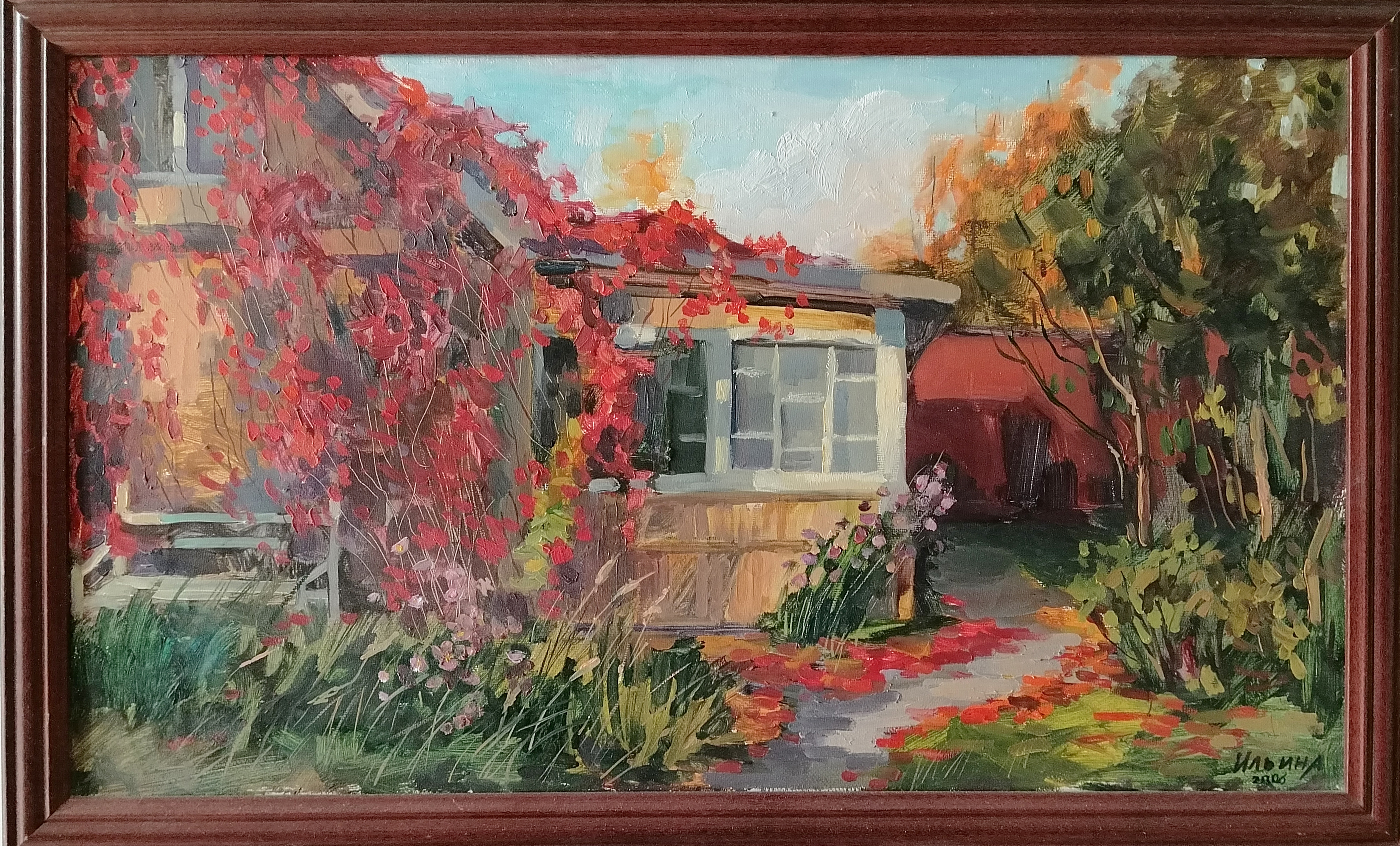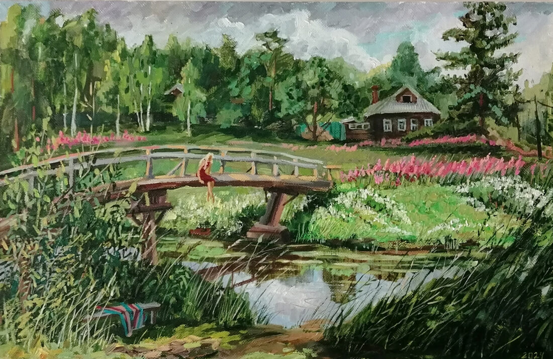 Во время написания картины у меня погиб мой кот. И на память о нем я его пририсовала в окне. Изначально задумка была другая. Вот такая история.   Основная часть моих работ на этой выставке посвящена деревне.