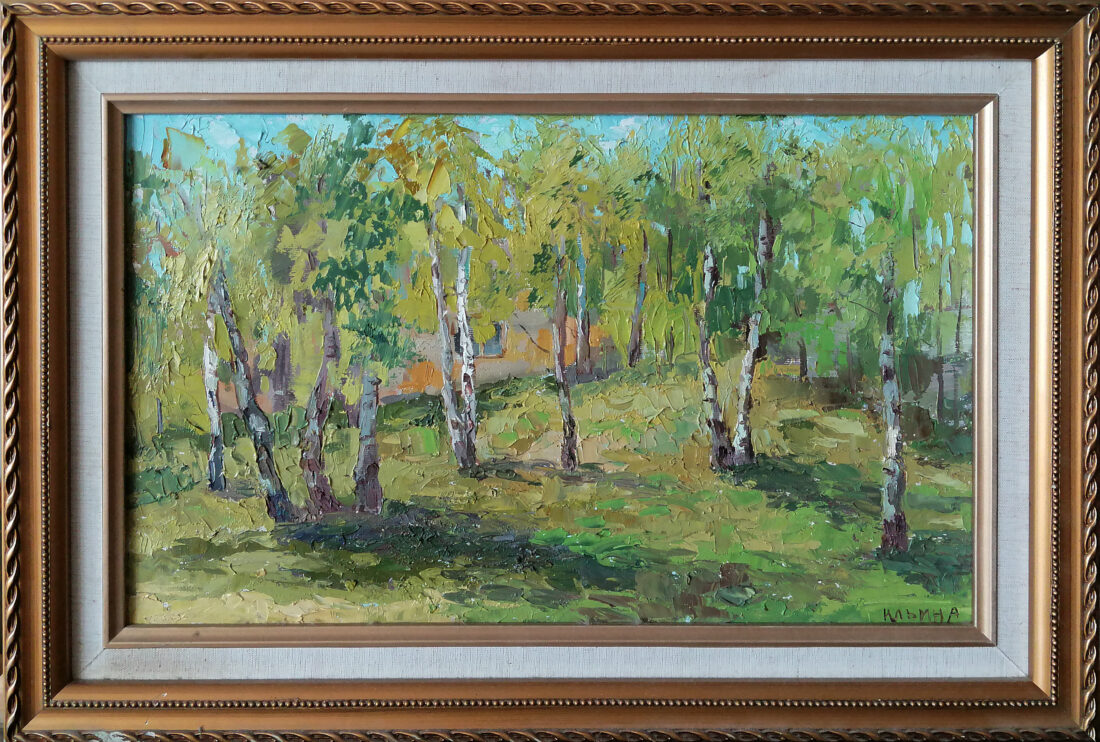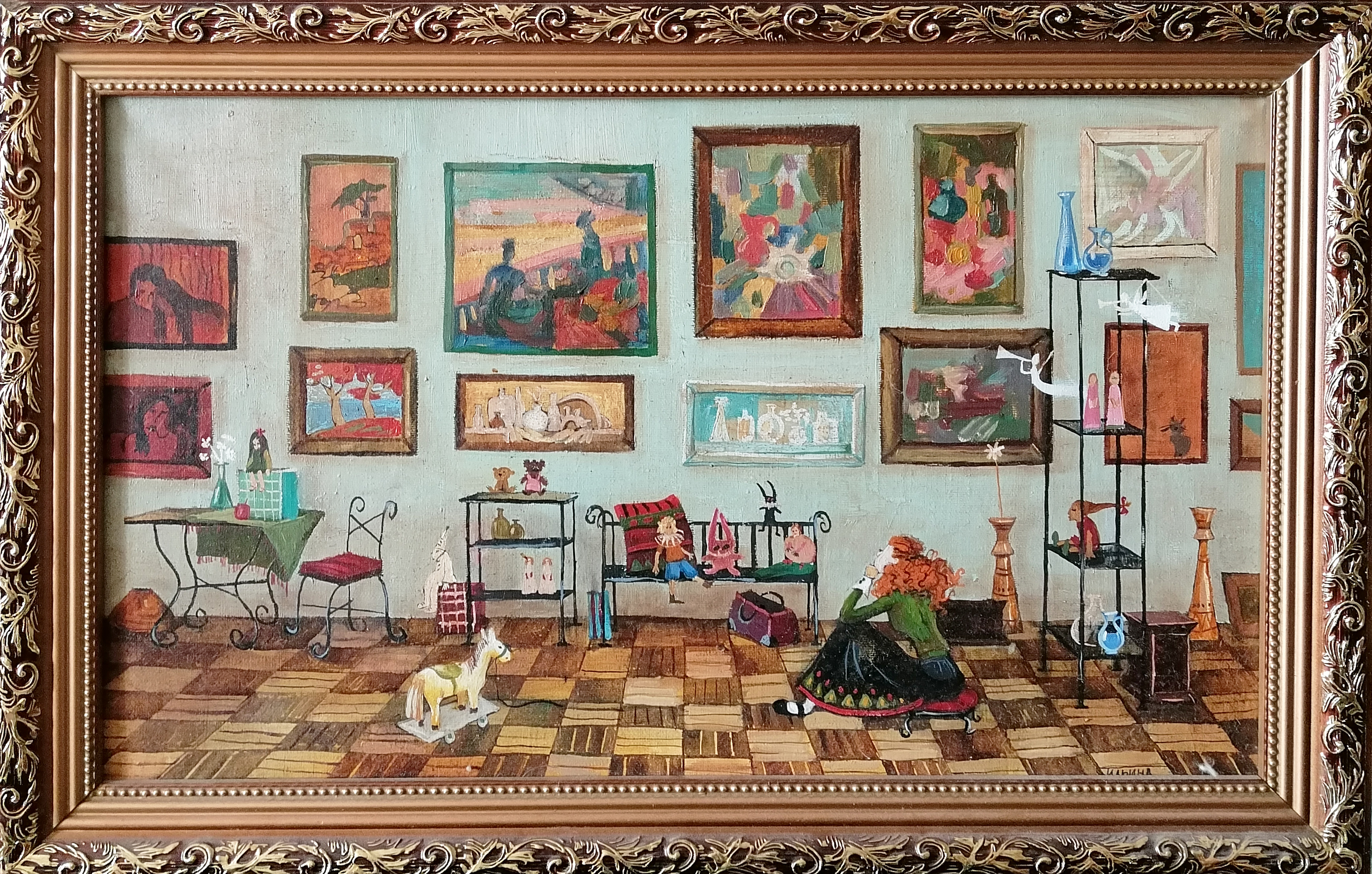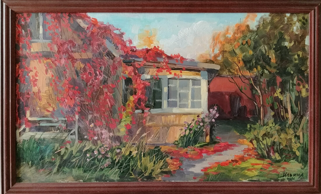 Немного хочу сказать о главной картине выставки «Золотые шары». На ней изображен мой дом, девочка на скамейке — моя дочь Ася, ей на момент создания картины было 6 лет. Для позирования я специально подобрала ей наряд и пришлось ей немного посидеть в одной позе, чему она была совсем не рада, что видно по выражению лица, которое мне удалось передать. Собака рядом с Асей —  соседская.